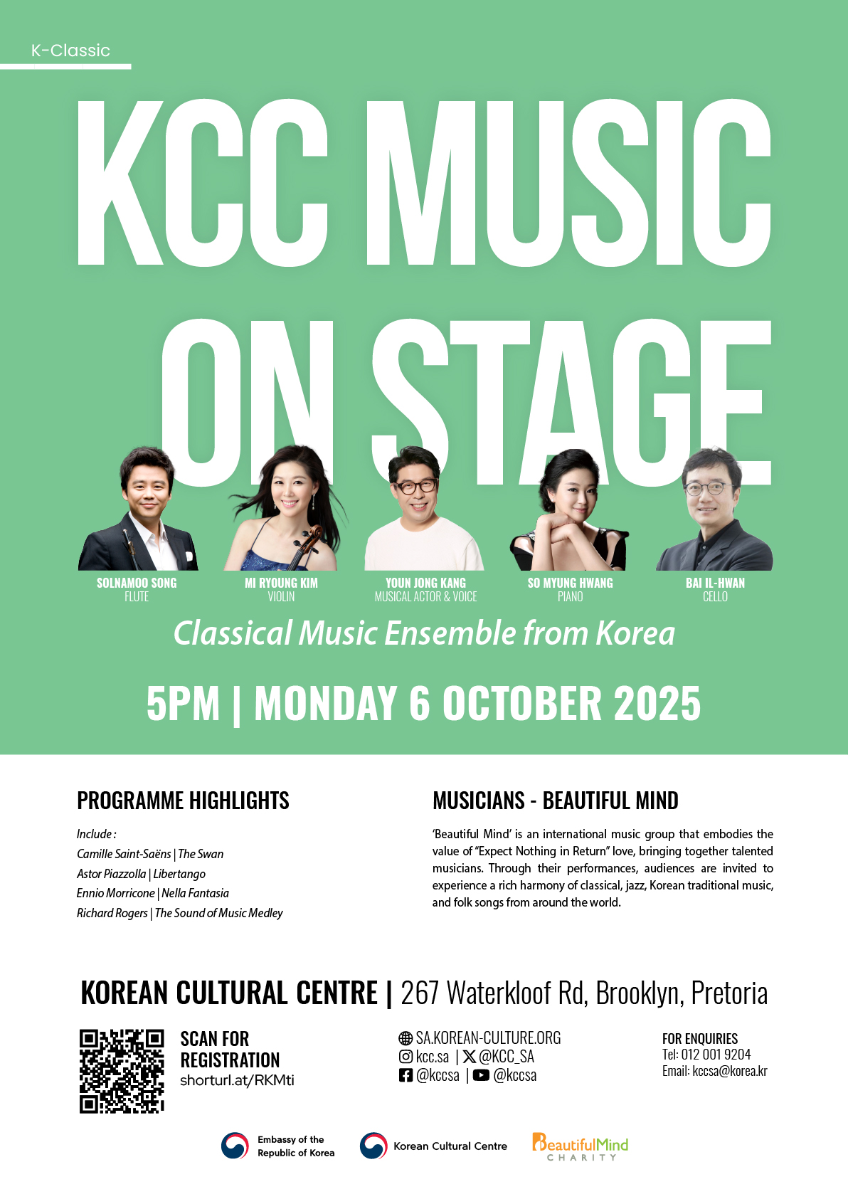 Join us for a delightful evening featuring the talented musicians from 'Beautiful Mind' at the Korean Cultural Centre in Pretoria.
