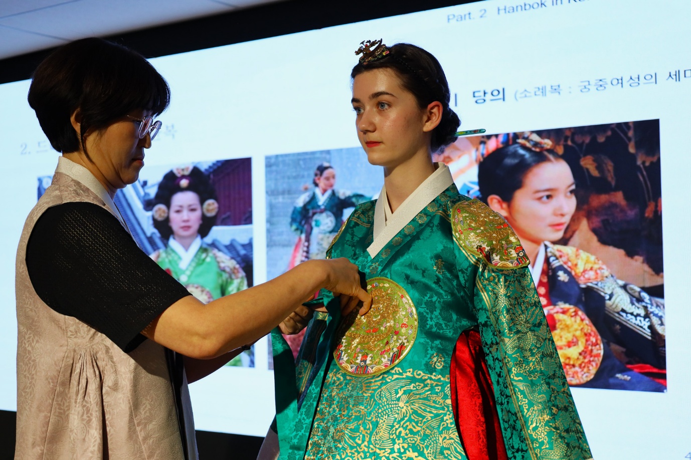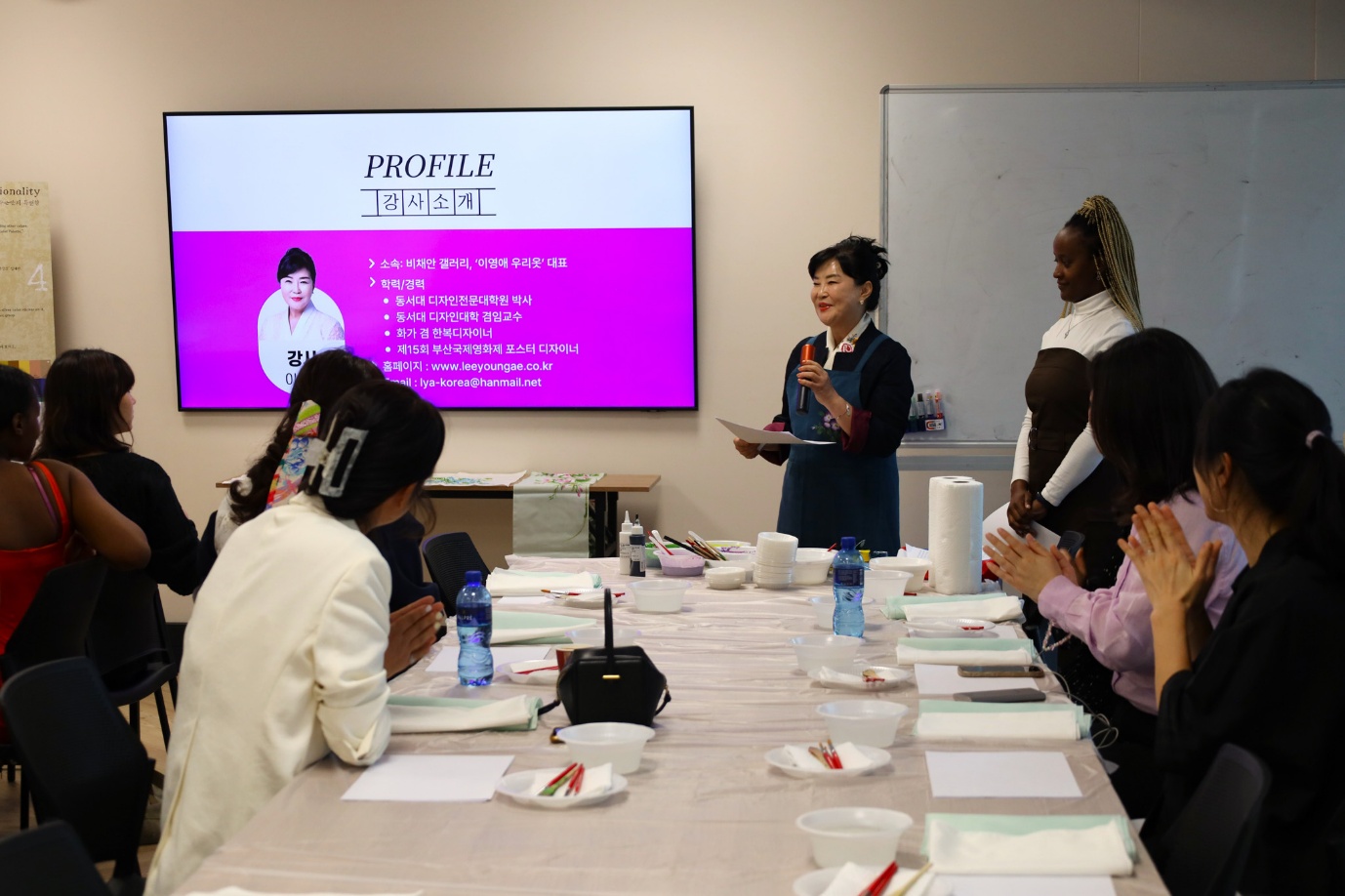The morning session opened with a lecture on the history and symbolism of hanbok, Korea’s traditional attire. Participants learned how this iconic garment has evolved over time while continuing to shine in modern contexts—from daily life to the big screen.