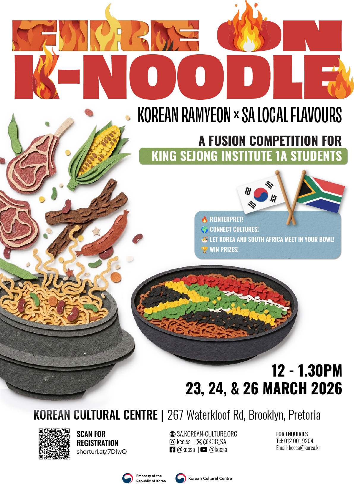 In this special K-Noodle Competition hosted by the King Sejong Institute at the Korean Cultural Centre, participants are invited to transform Korean ramyeon (instant noodles) into something uniquely their own. By adding garnishes and ingredients inspired by South African landscapes, culture, and flavours, students will create dishes that tell a story of connection between Korea and South Africa.