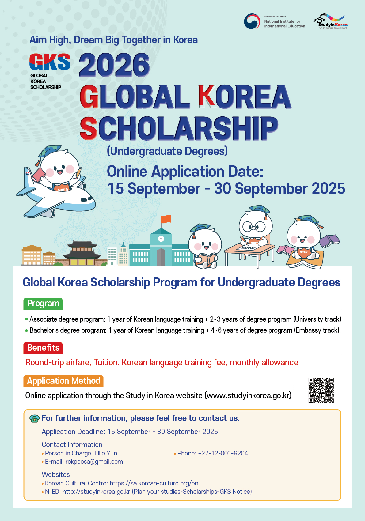 The Global Korea Scholarship (GKS) has officially opened its undergraduate programme to South Africa. Now you can pursue your degree in Korea with full funding, joining a community of global scholars while immersing yourself in one of Asia’s most dynamic cultures.